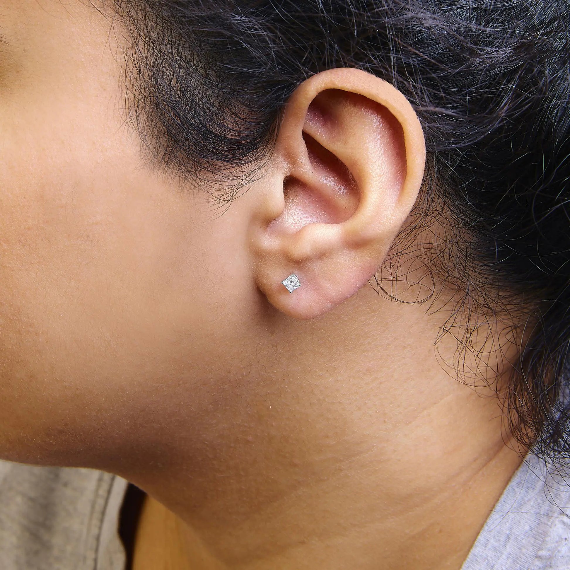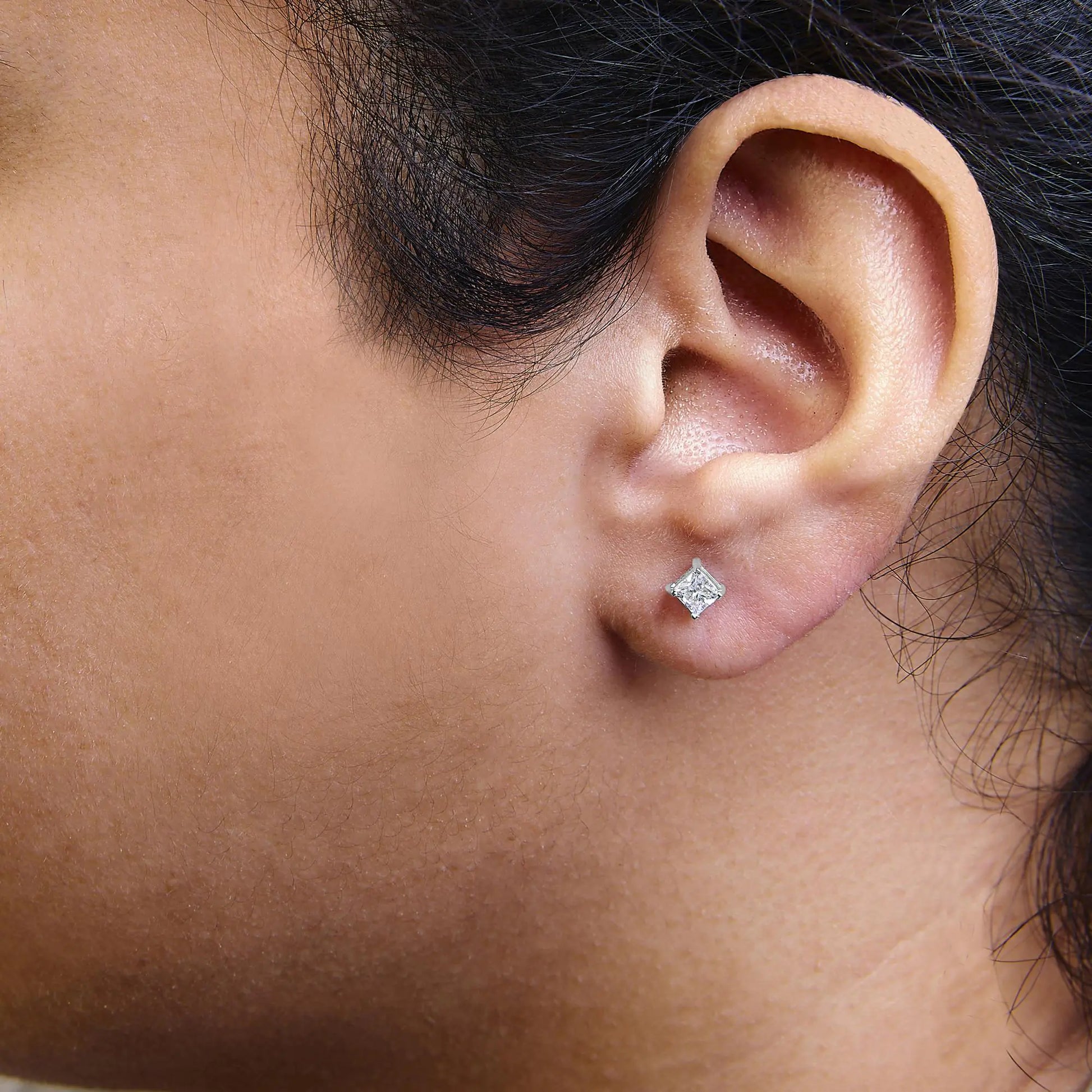 Embrace timeless elegance and modern sophistication with these exquisite 14K white gold solitaire stud earrings. Each earring is meticulously crafted to showcase a dazzling 1/2 carat lab-grown princess cut diamond, offering a total carat weight of 1 for the pair. These stunning gems are celebrated for their F-G color and VS2-SI1 clarity, ensuring a brilliant sparkle that captures the essence of luxury. Expertly set in a secure four-prong setting, these diamonds reflect the pinnacle of craftsmanship and design. The earrings are further enhanced by a rhodium plating over the white gold, giving them a luminous, high-polish finish that accentuates their beauty. Designed for those who appreciate the marriage of innovation and tradition, the earrings come equipped with push backs to ensure a secure and comfortable fit. Perfect for every occasion, from daily wear to the most glamorous events, these earrings promise to be a cherished addition to any jewelry collection, embodying both the allure of diamonds and the prestige of fine jewelry.