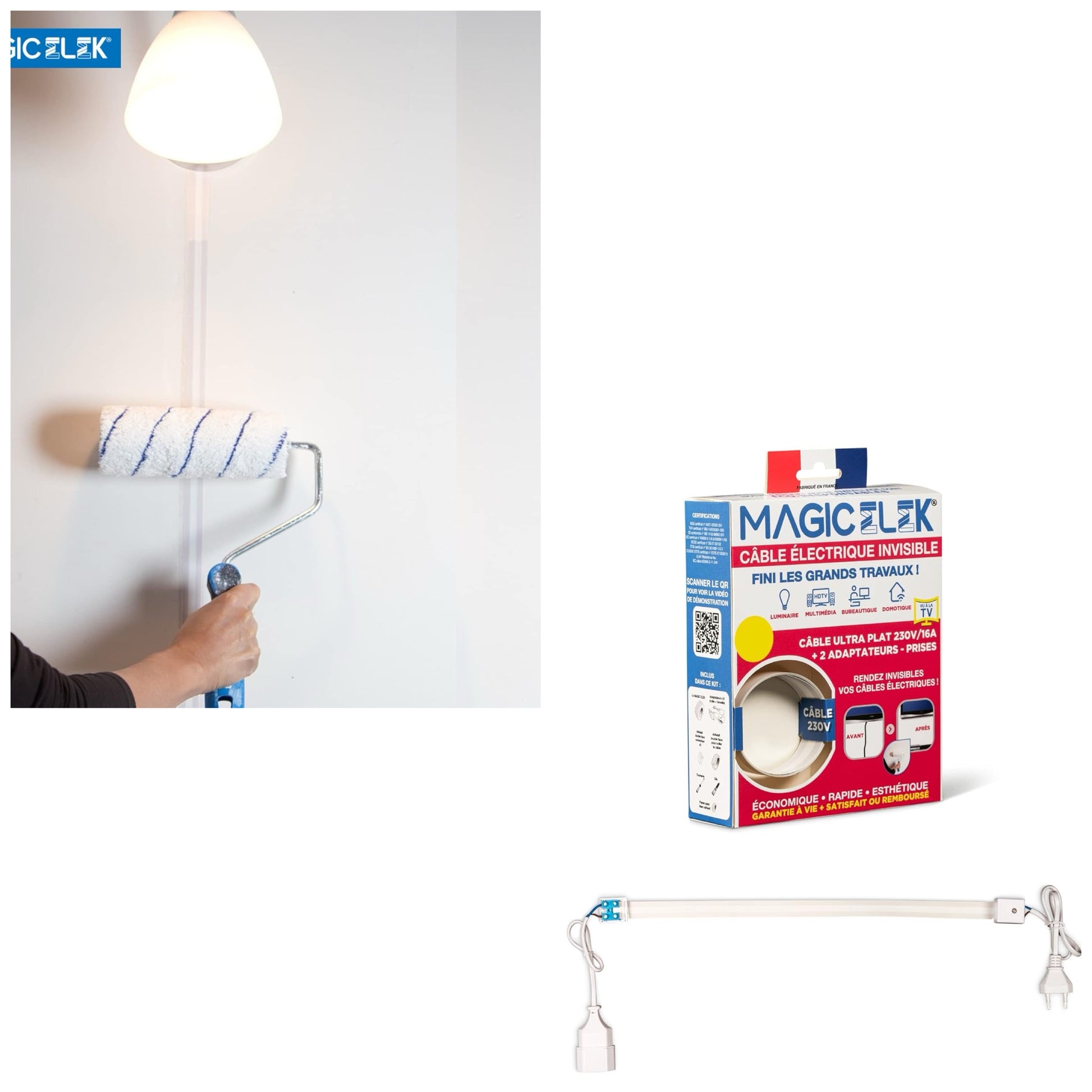 SOLUTION DE CABLAGE ELECTRIQUE INVISIBLE Qui sommes-nous ? A propos de nous, nous sommes une entreprise française proposant des câbles électriques invisibles pour différents types d'utilisation comme l'éclairage, l'informatique, la domotique ou encore pour différents éléments multimédia. La solution Magic Elek est brevetée mondialement, ce qui fait de nous les pionniers (produit authentique et unique). Notre pack contient tous les accessoires pour une pose invisible, facile, rapide et immédiate du câble électrique Magic Elek 230V/16A : Il est fabriqué en France par une usine d'application militaire et médicale à la pointe de la technologie. Vous pouvez couper votre câble sur mesure avec une paire de ciseaux. Connectez ensuite le câble ultra plat au connecteur fournis dans le pack. Collez enfin votre câble sur la surface que vous aurez choisie. Vous pouvez aussi mettre de l'enduit pour qu'il disparaisse complètement. Très pratique dans ce contexte, notre câble vous évite les goulottes et les saignées électriques. Vous pouvez enfin faire passer votre électricité sous votre sol carrelé, ou même sous votre moquette ou votre parquet. Vous avez rêvez d'un salon sans fils électriques qui pendent? Nous aussi. Nous avons créé Magic Elek pour vos que vos salons soient à l'image de votre perfection, rapidement et facilement même pour les moins bricoleurs.