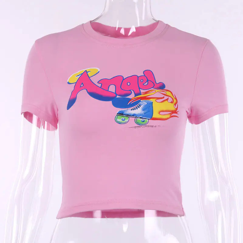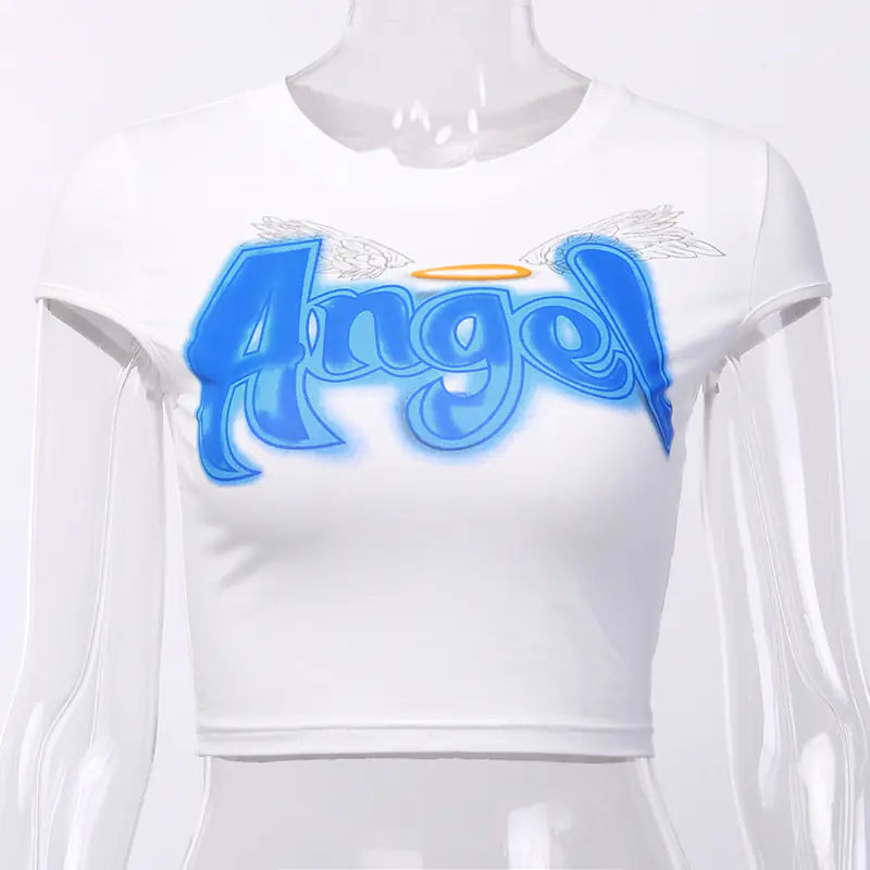 Unleash your inner street style with our trendy short-sleeve crop top designed specifically for the modern woman. This chic piece features a playful Angel print that exudes a sense of fun and flirtation, making it perfect for summer outings and casual gatherings.